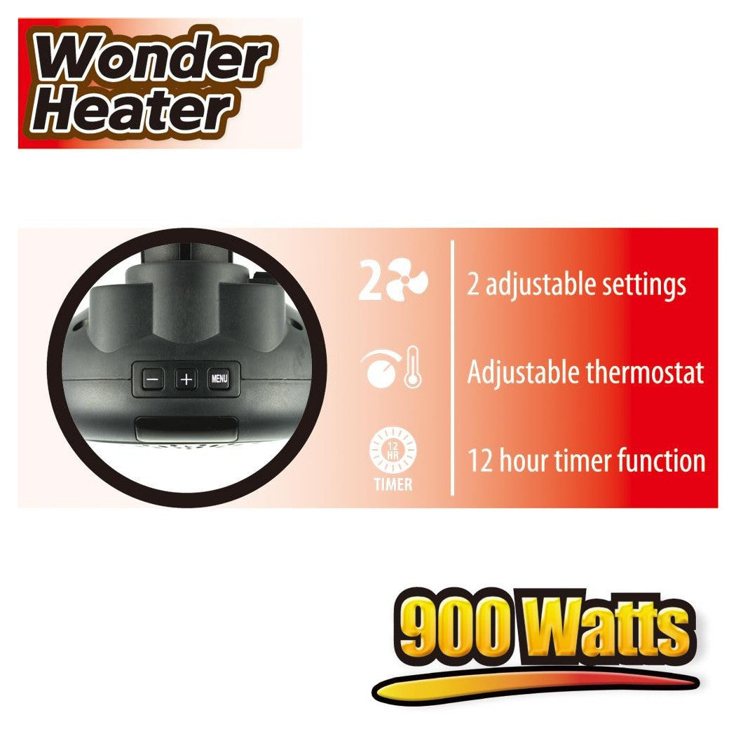 Le Wonder Heater est équipé d’un thermostat ajustable qui vous permet de choisir la température idéale. Il dispose également d’un timer programmable jusqu’à 12 heures pour économiser l’électricité et garantir une utilisation sécurisée.